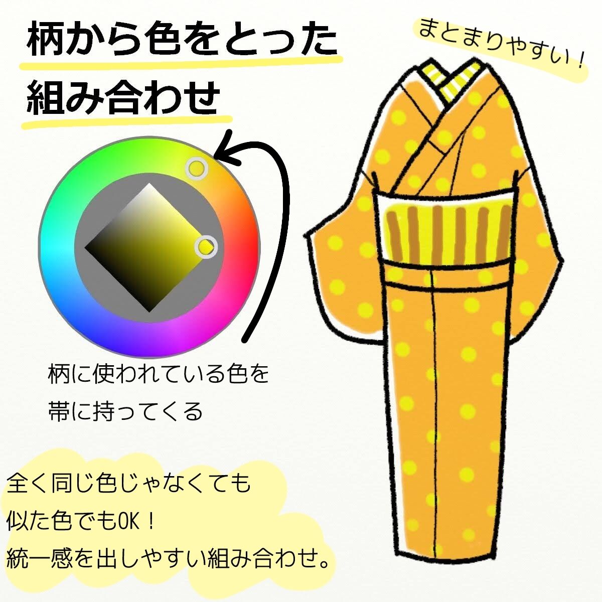 着物の地色(一番面積の広い色)から考える組み合わせ。