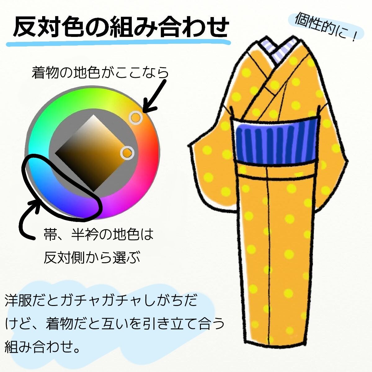 反対色(似ていない色)は、着物ならではの組み合わせですね。