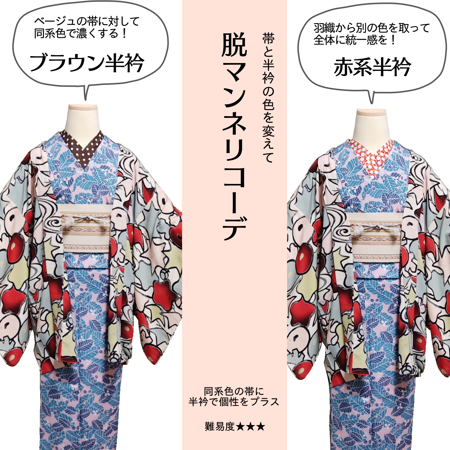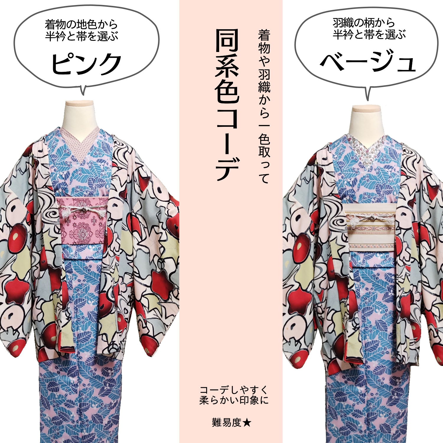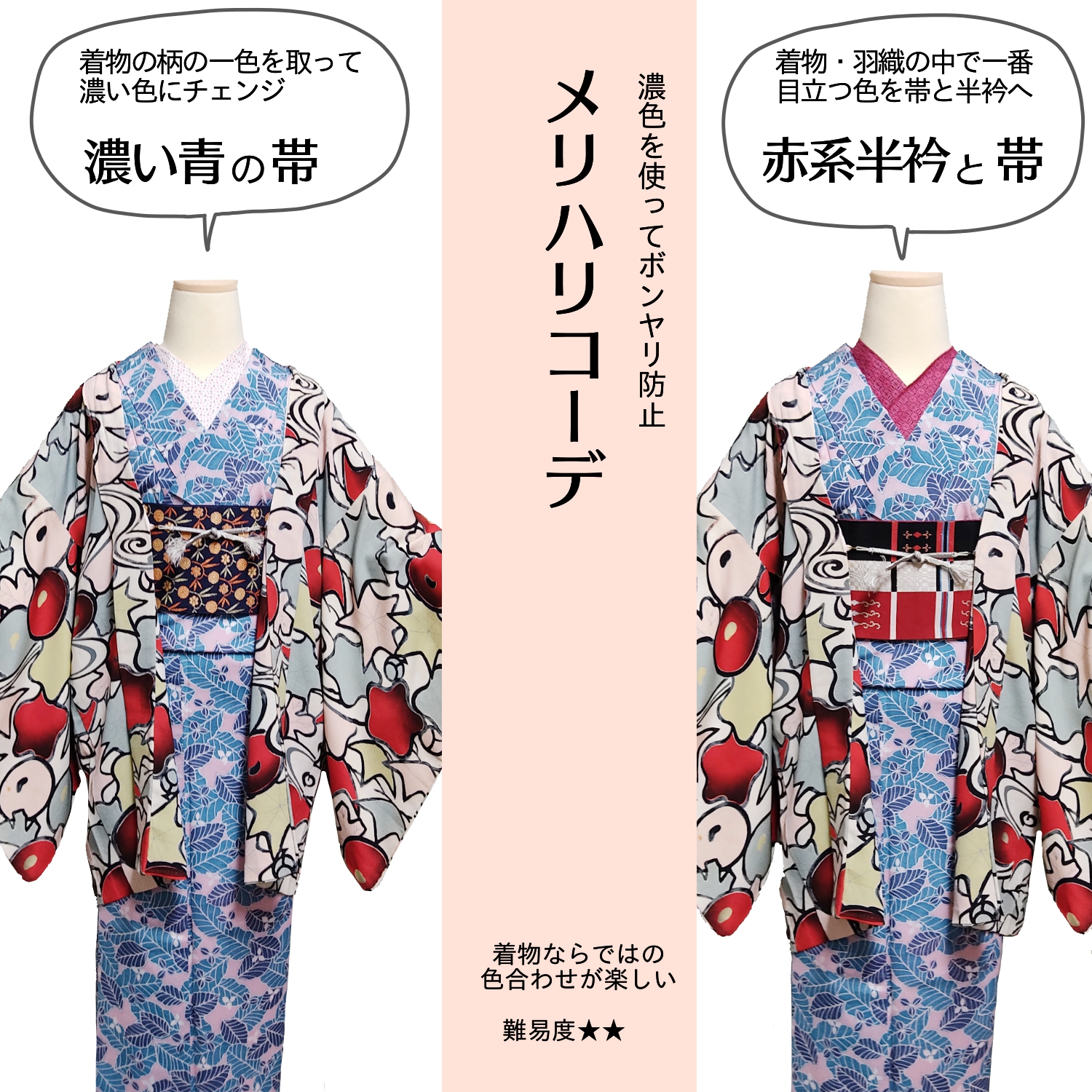 帯と半衿だけ変えて、いろんなコーデを作ってみます。