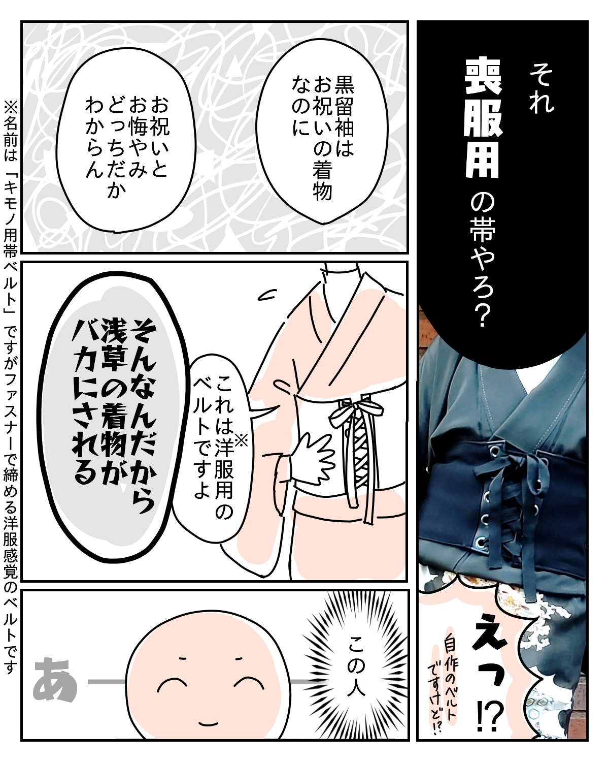今回はキモノ用帯ベルトが真っ黒だったため、喪の帯と勘違いされてしまったのが文句言われポイントでしたが、