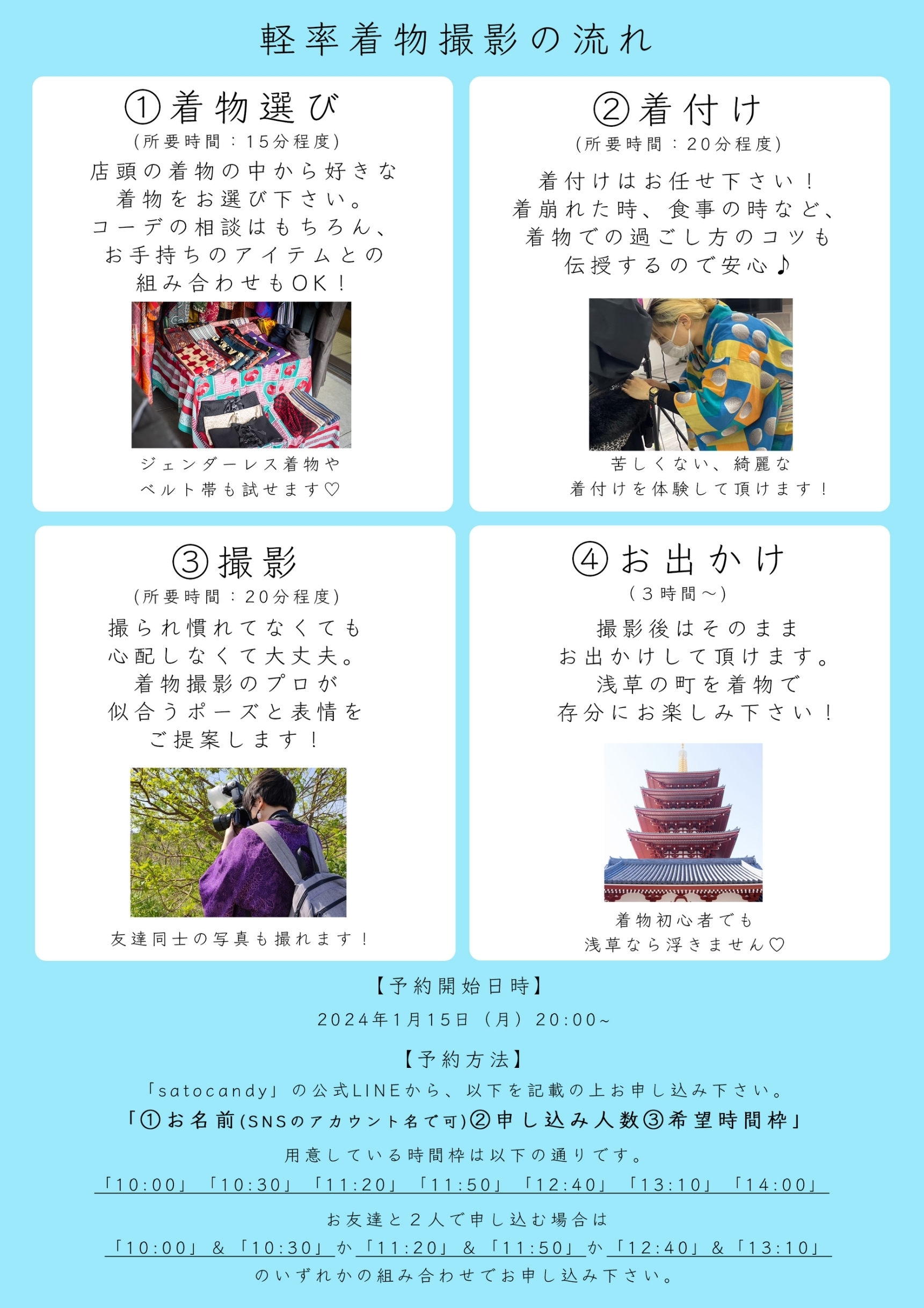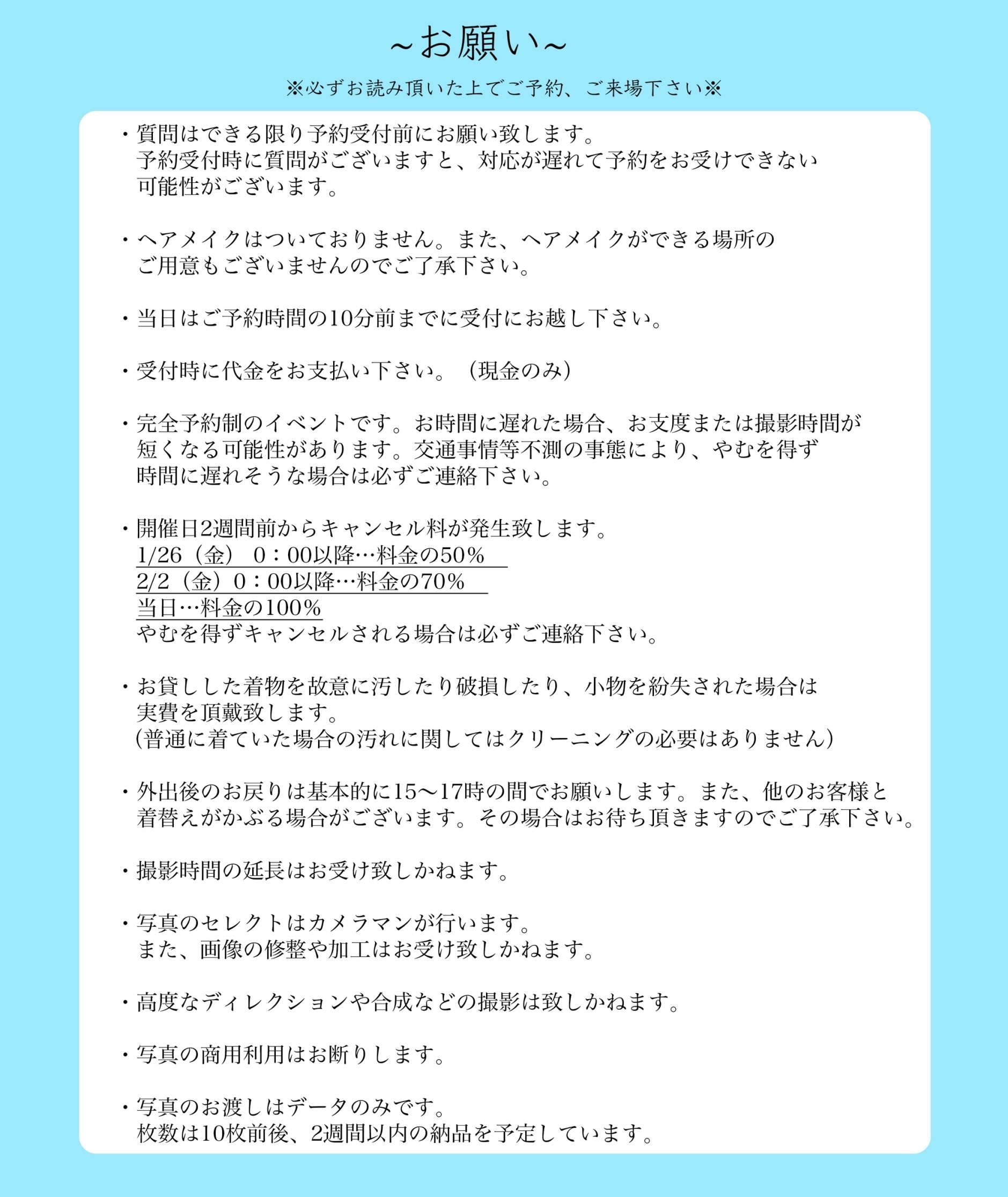 ※カジュアルな撮影会のため、礼装はご用意がありません。また冠婚葬祭等の記念撮影も承れません。ご了承ください。