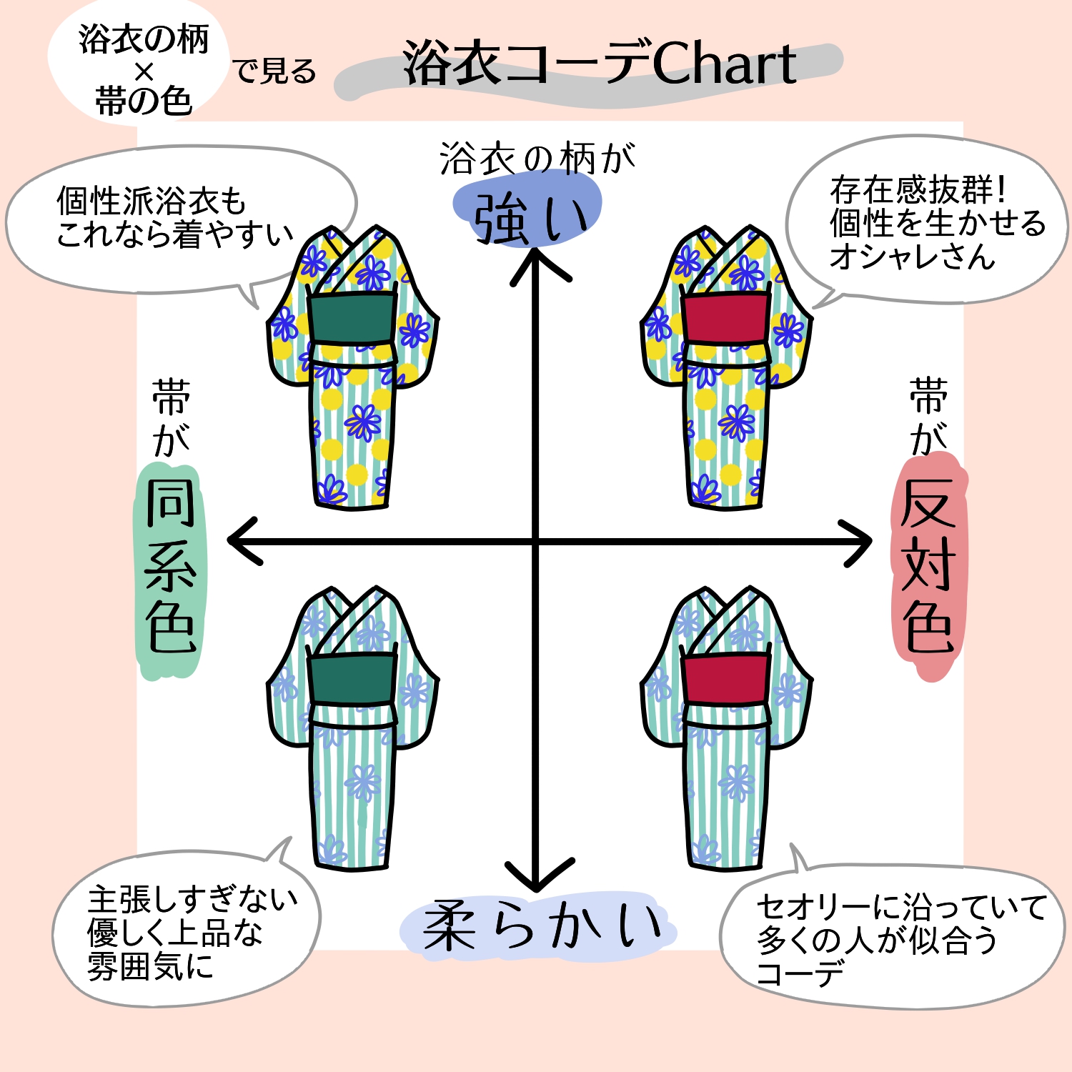 上記のチャートを参考に、自分と浴衣と帯を客観的に見て、