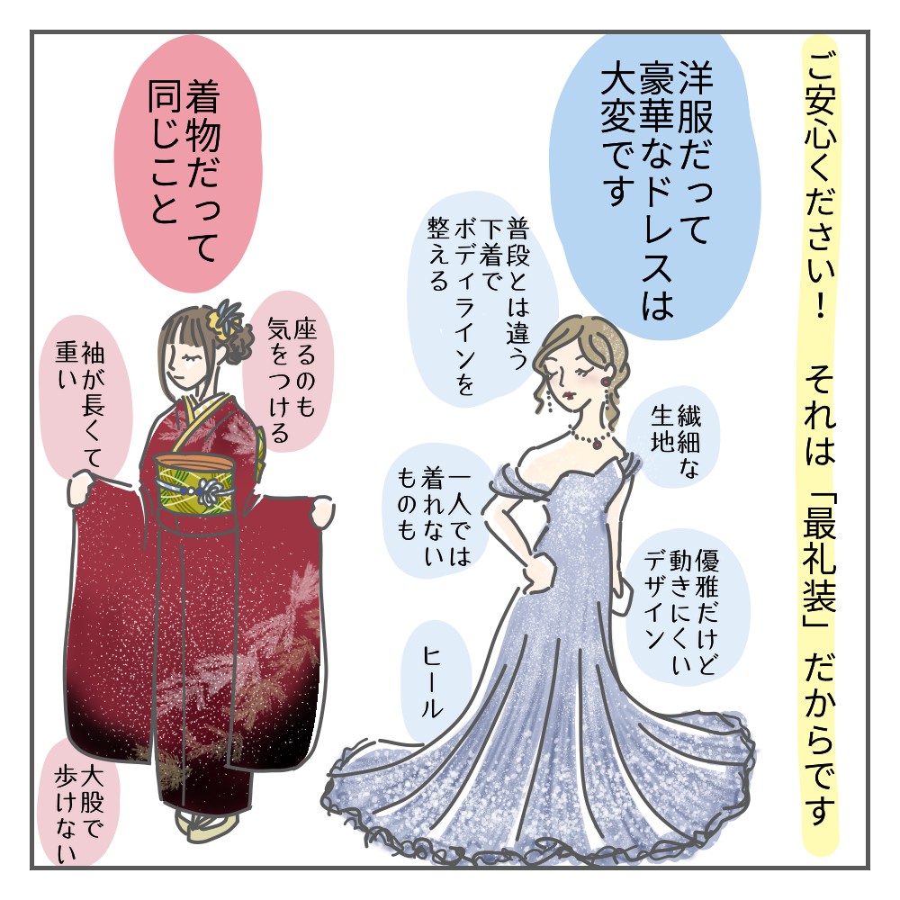 豪華に着飾るほど動きにくくなるし、色々と気を遣うのは、和洋問わず同じことだと思うんです。
