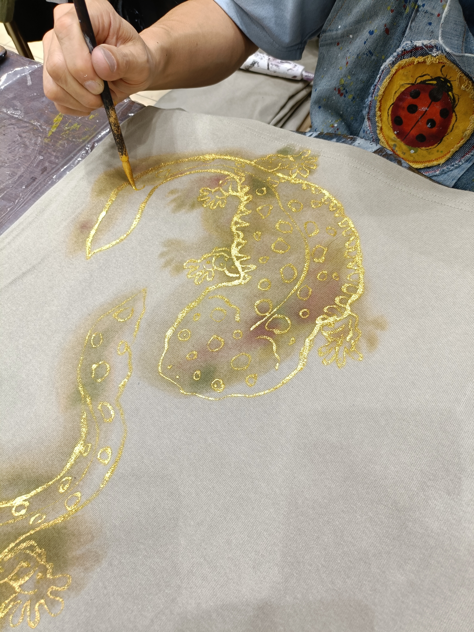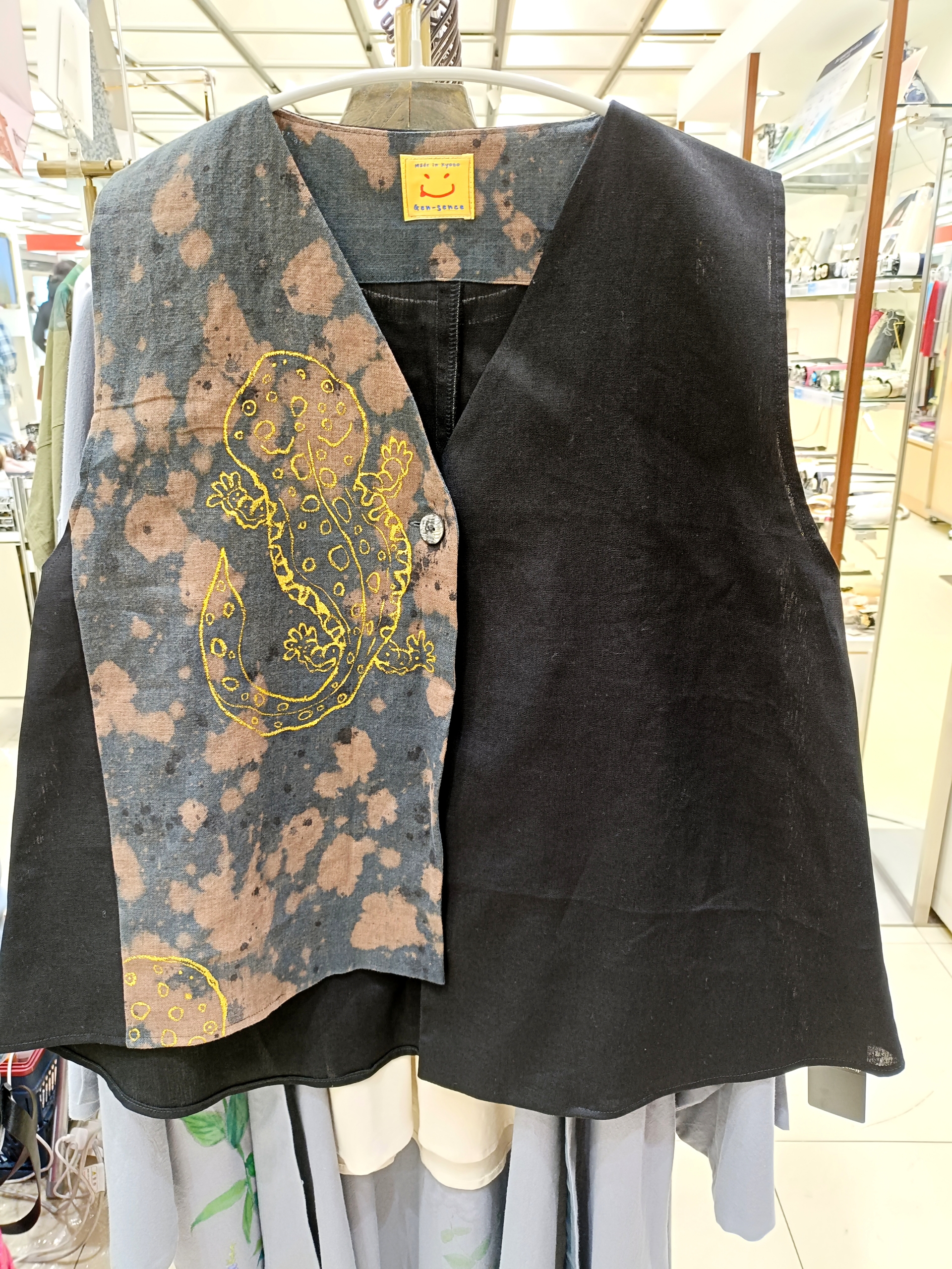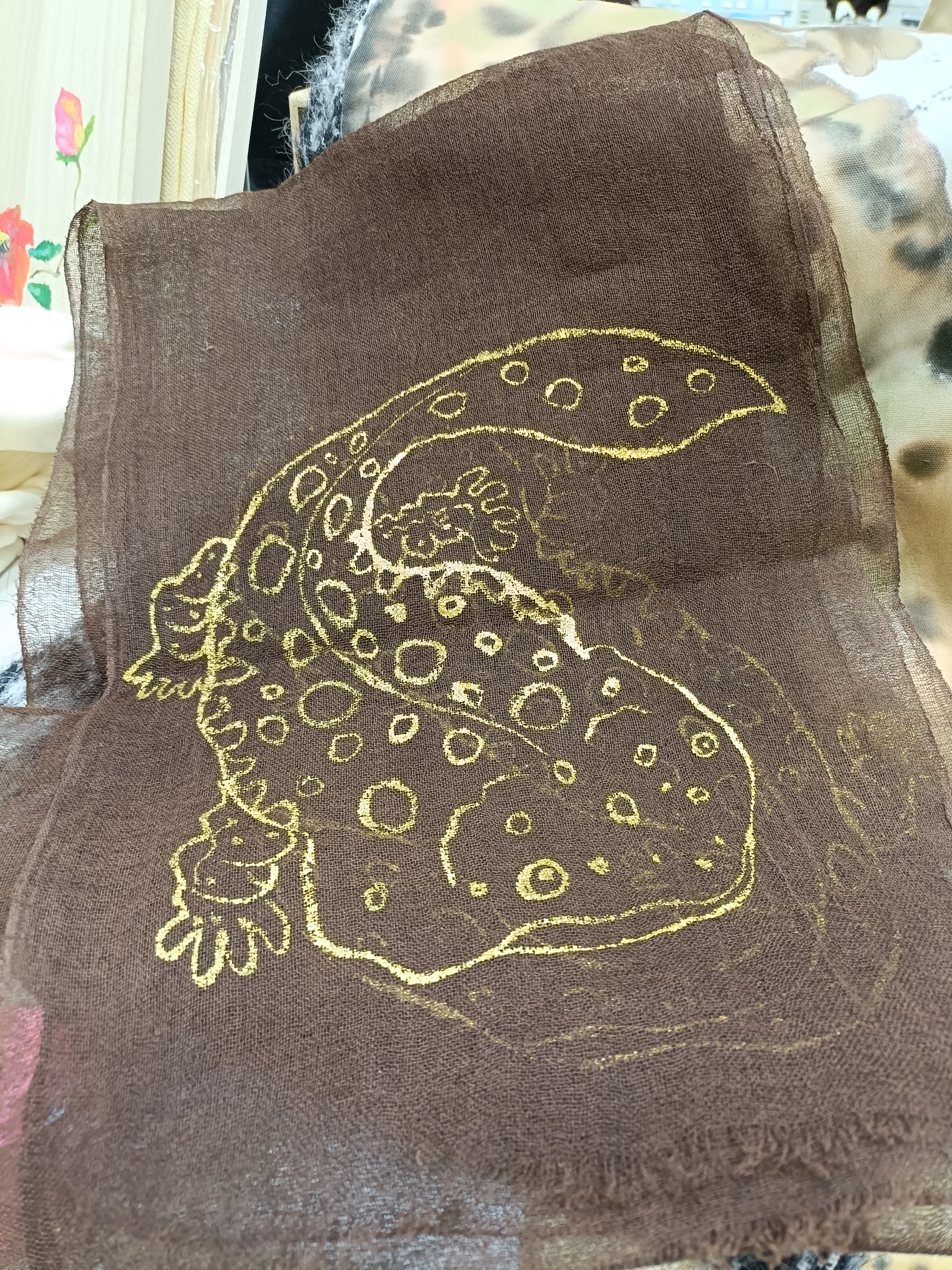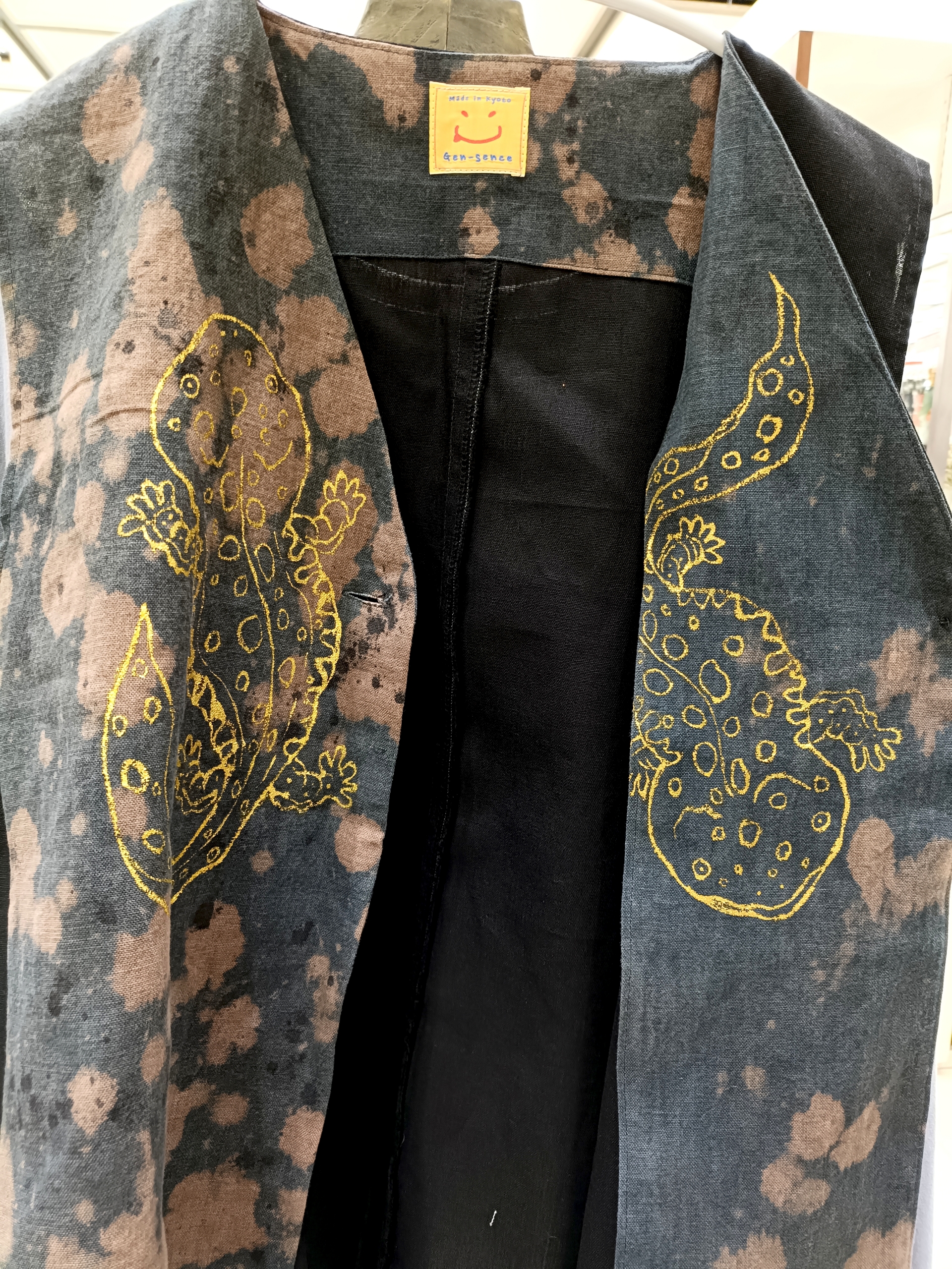 地色を柿渋で染めて、更に藍でまだらに染めて、その上にオオサンショウウオを金で手描き!