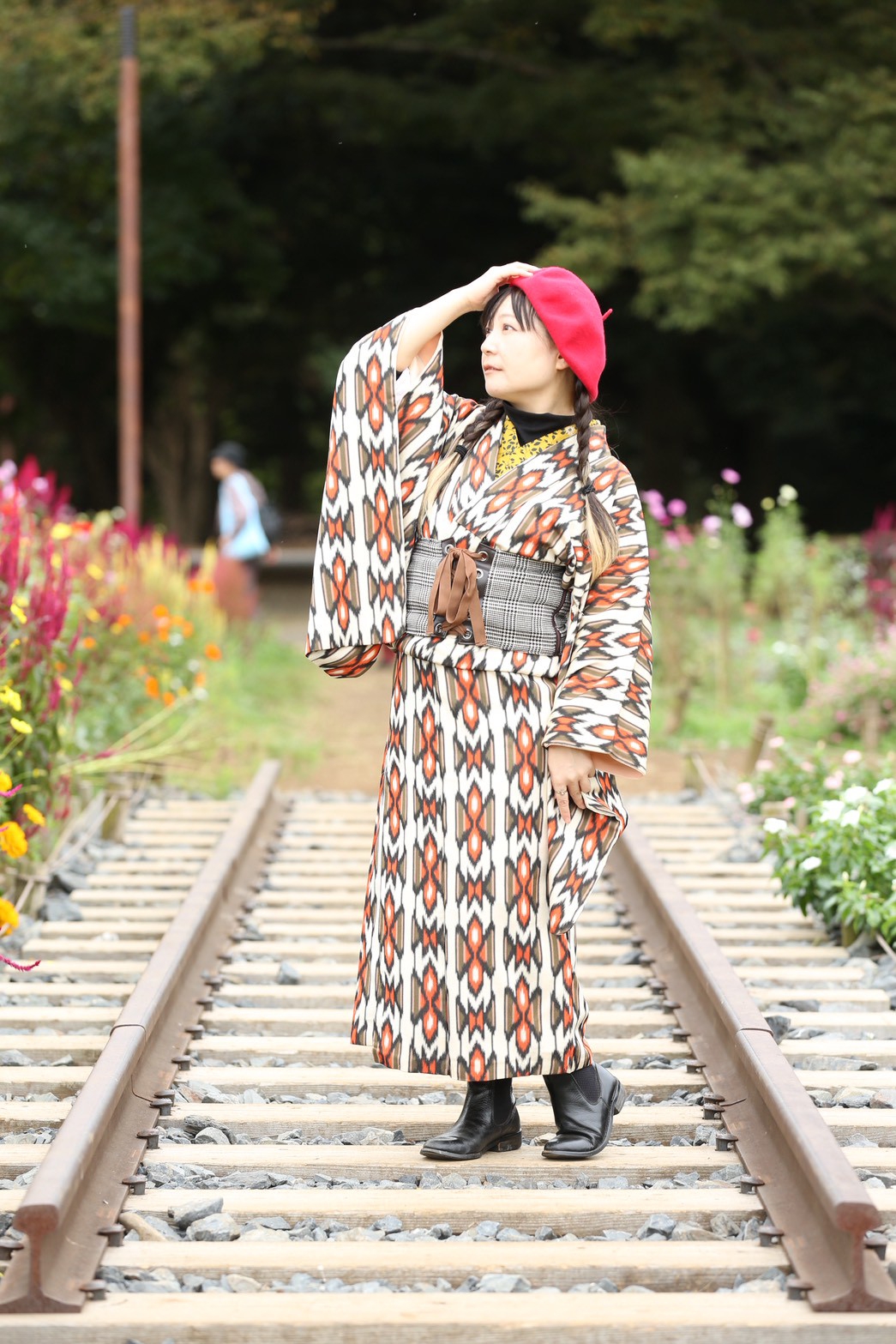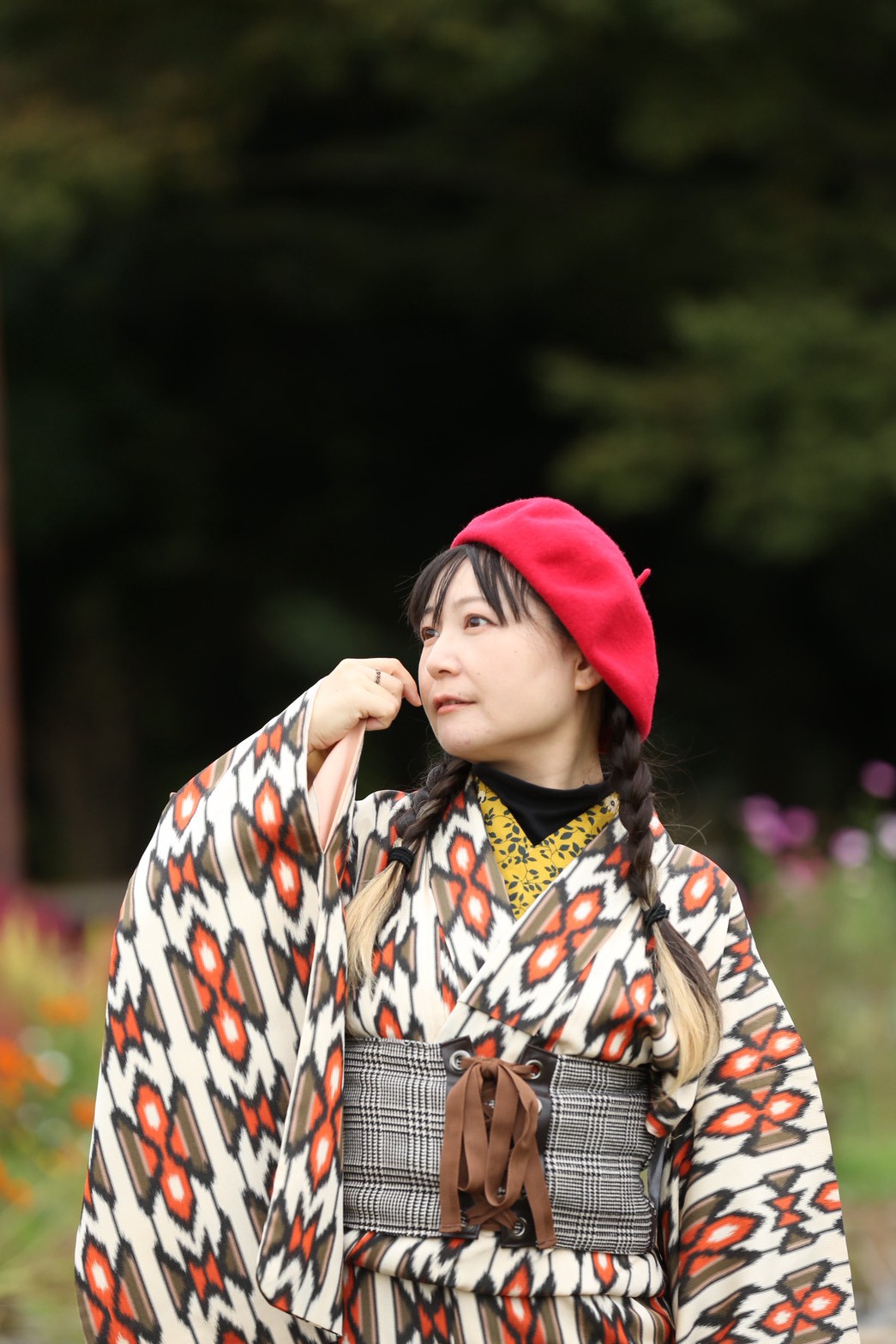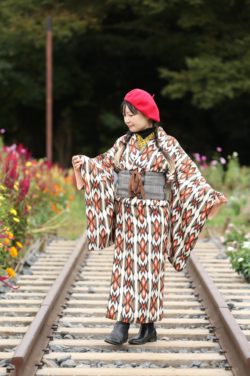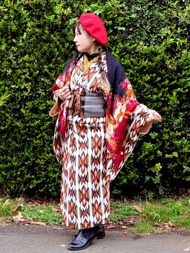 キモノ用帯ベルトとベレー帽で和洋折衷コーデ。
